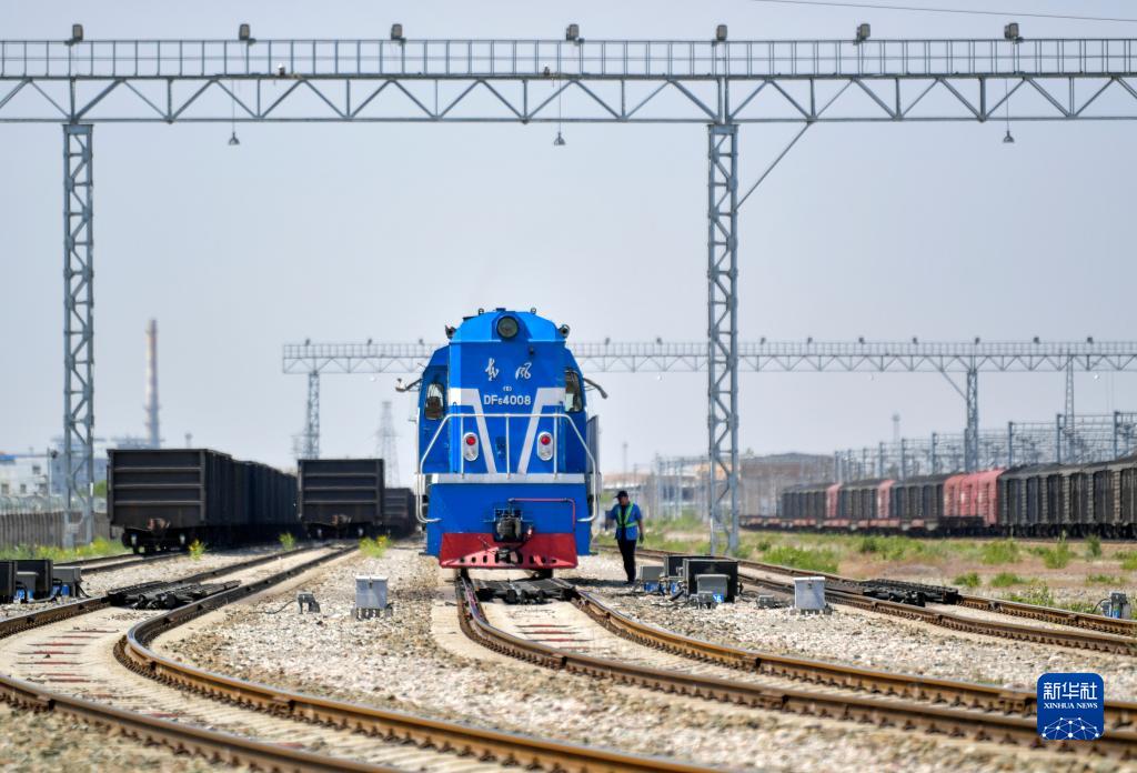5月11日,在新疆霍爾果斯鐵路口岸,工作人員在駝峰場(chǎng)檢查火車(chē)頭。
