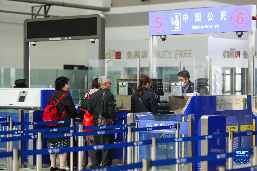 5月10日,在新疆霍爾果斯聯(lián)檢大廳出境通道,出境人員排隊辦理邊防檢查手續。