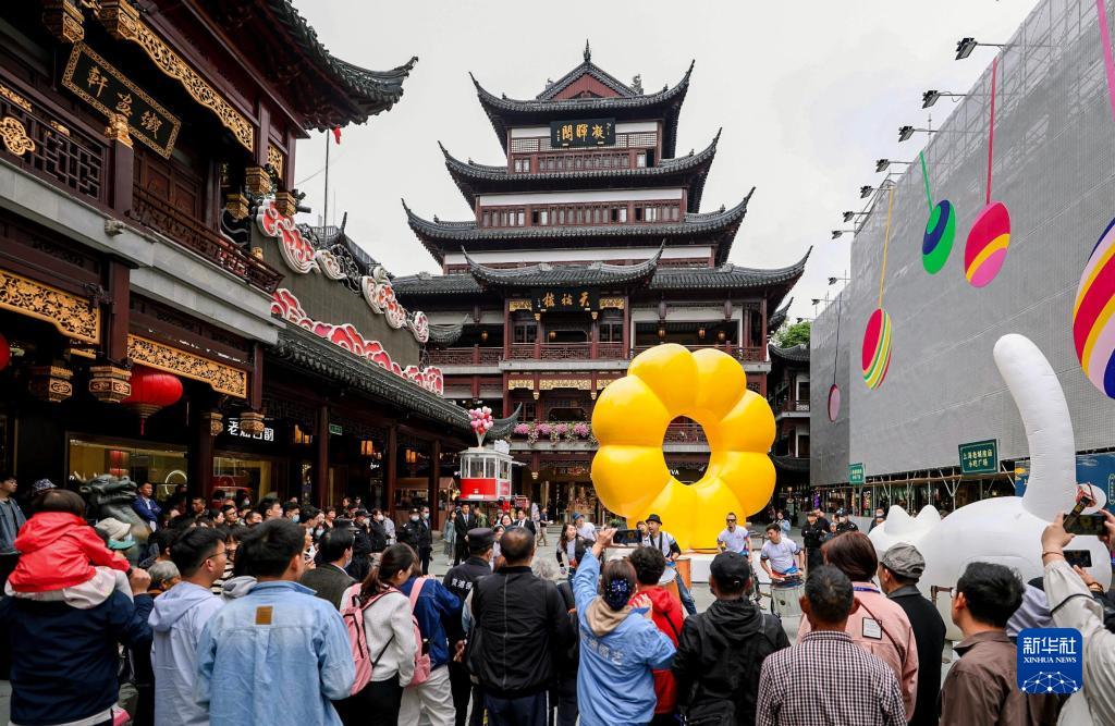 5月7日,市民游客在上海豫園商城中心廣場(chǎng)觀(guān)看街頭藝術(shù)表演。新華社記者 劉穎 攝