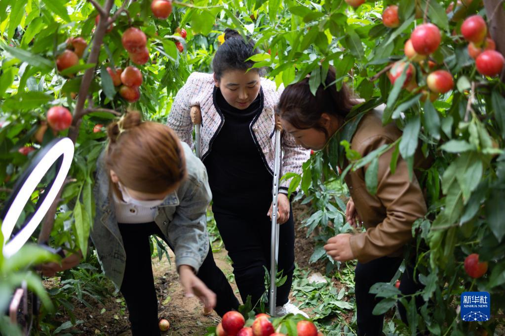 5月10日,在陜西渭南市大荔縣埝橋鎮北黃村油桃大棚,馬寧(中)在網(wǎng)上做直播帶貨后與同事收拾油桃。
