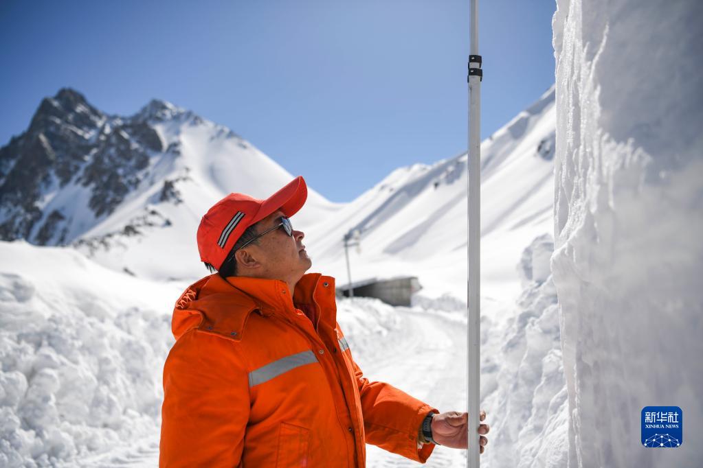 烏蘭薩德克養護站工人宋雪嶺在海拔約3400米的哈希勒根隧道附近測量積雪深度(5月10日攝)。