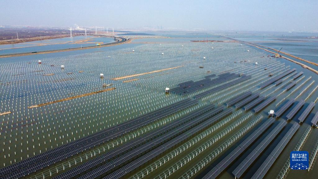 這是建設中的天津濱海新區龍源海晶鹽光互補項目(2023年2月7日攝,無(wú)人機照片)。