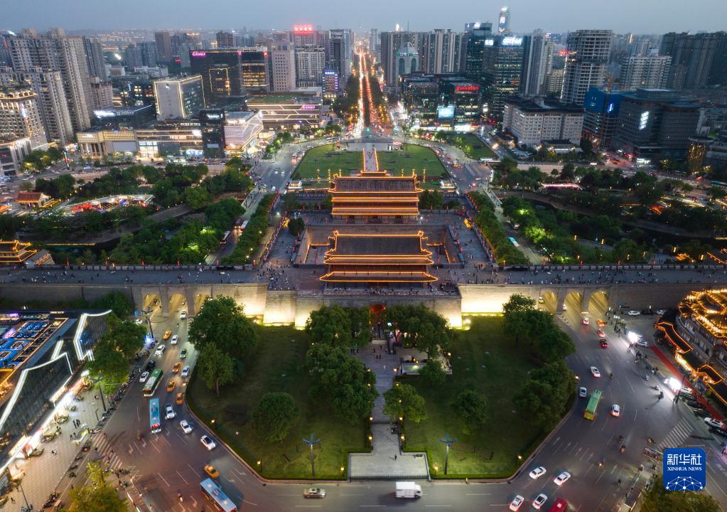 夜色下的西安城墻永寧門(mén)及周邊商圈(4月25日攝,無(wú)人機照片)。