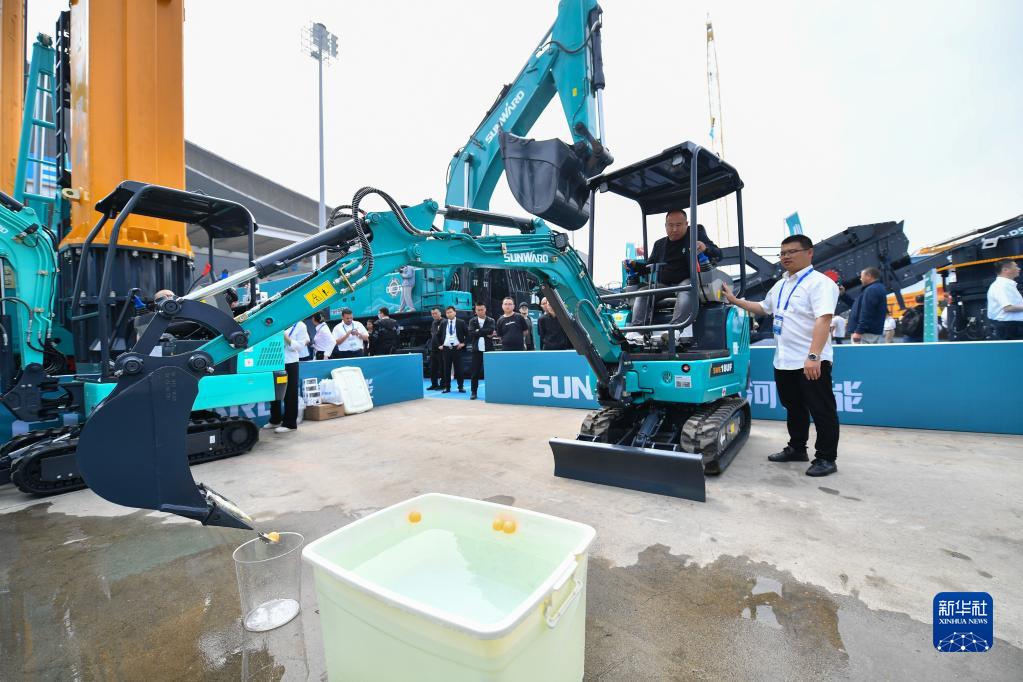 5月12日,在長(cháng)沙國際工程機械展覽會(huì )室外展區,觀(guān)眾在工作人員的指導下體驗微型挖掘機搬運乒乓球。