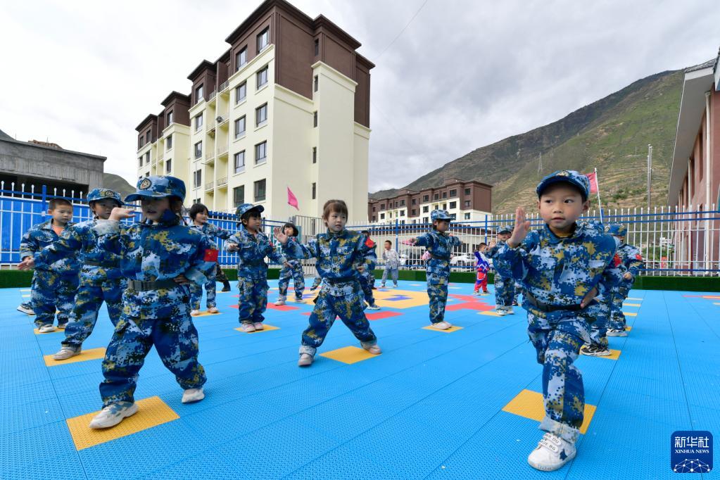 5月9日,在甘肅省隴南市宕昌縣沙灣鎮生態(tài)及地質(zhì)災害避險搬遷安置房旁的新起點(diǎn)幼兒園,孩子們在戶(hù)外上課。