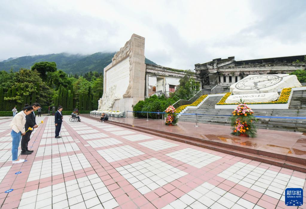 5月8日,在四川省汶川縣映秀鎮漩口中學(xué)遺址,曲海望(左一)和鐘朝輝(左二)向地震遇難者默哀。