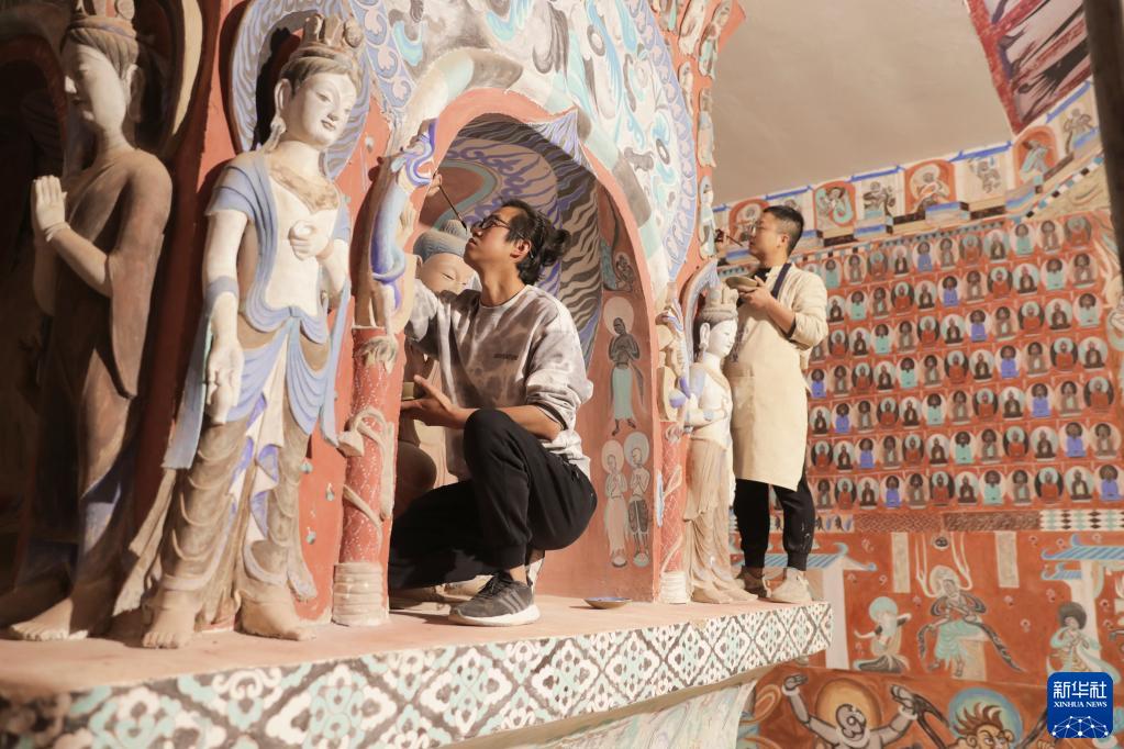 5月11日,在位于敦煌市的莫高里工匠村,學(xué)員為莫高窟復制窟進(jìn)行彩繪。