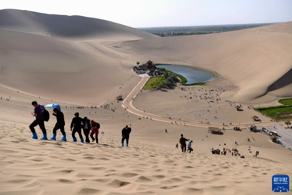 5月11日,游客在鳴沙山月牙泉景區爬沙山。