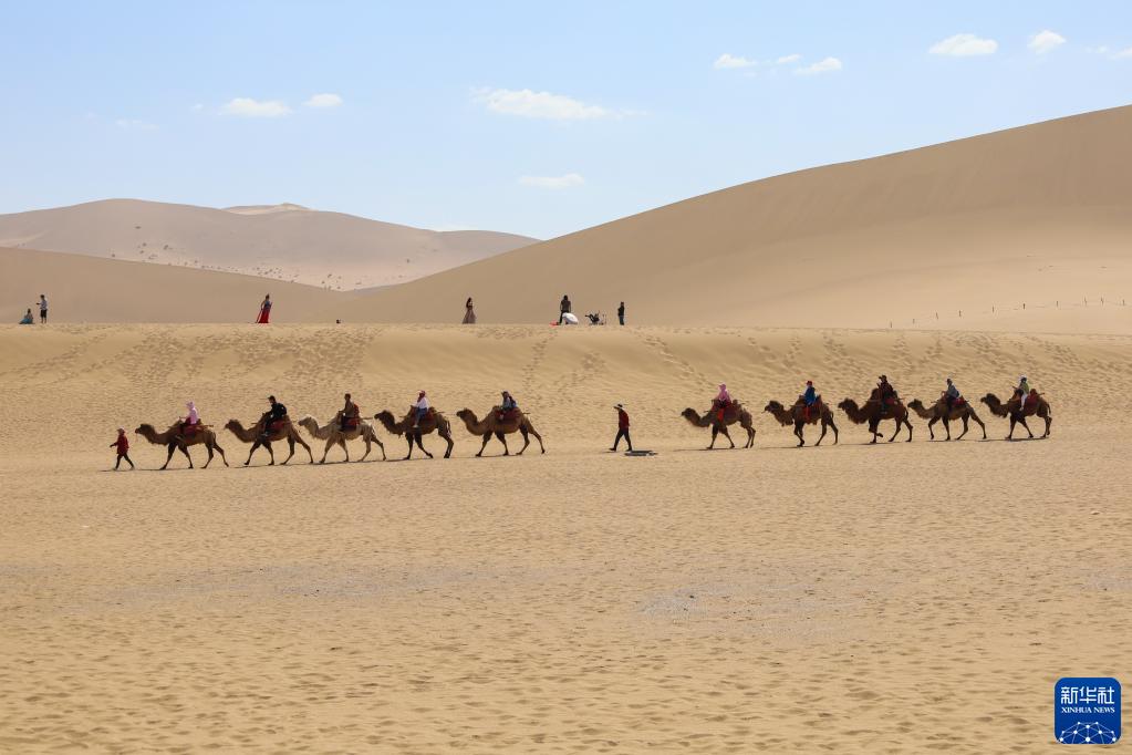 5月11日,游客在鳴沙山月牙泉景區騎駱駝?dòng)^光。