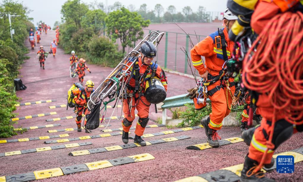 消防救援人員背負裝備前往演練場(chǎng)地(5月11日攝)。