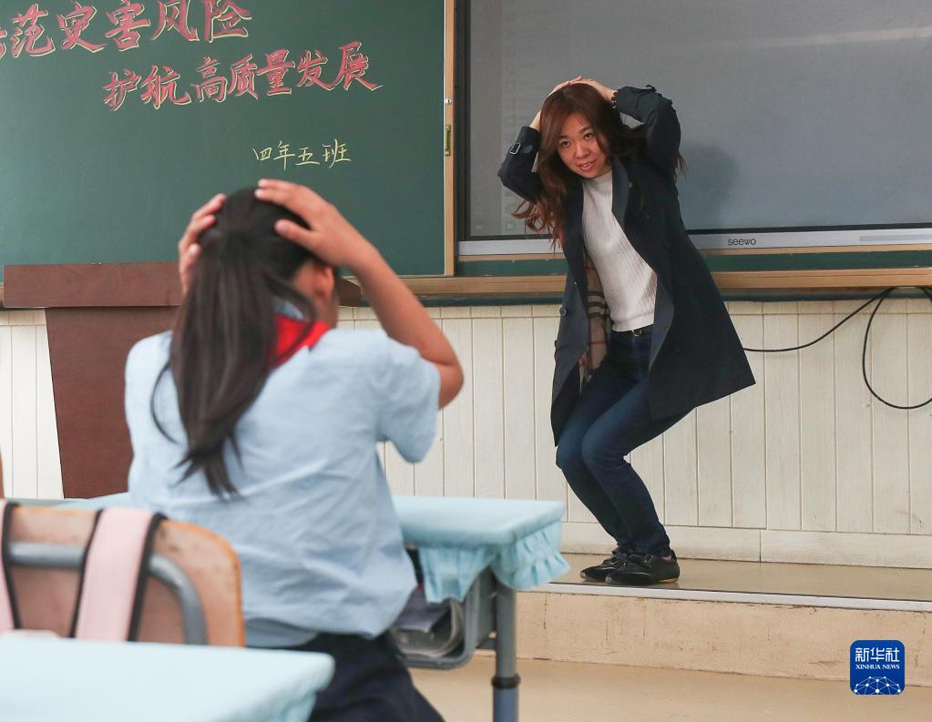5月12日,沈陽(yáng)市北塔小學(xué)的老師為學(xué)生演示應急避險動(dòng)作。