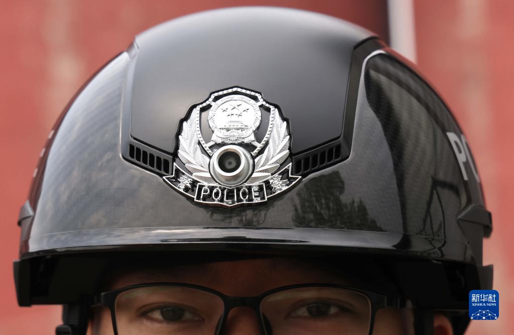 5月12日,工作人員在展示光啟警用智能頭盔。