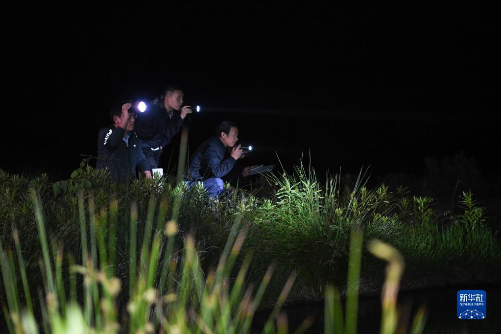 5月9日晚,調查人員在安徽揚子鱷國家級自然保護區郎溪高井廟片區核心棲息地巡查。