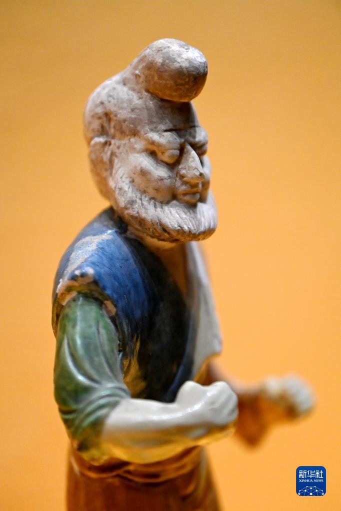這是在西安博物院展出的唐代三彩胡人牽馬(駝)陶俑(5月8日攝)。唐代的長(cháng)安城中居住著(zhù)大批胡人,胡樂(lè )、胡服風(fēng)靡長(cháng)安,經(jīng)考古出土的陶俑中有為數不少的胡人形象。