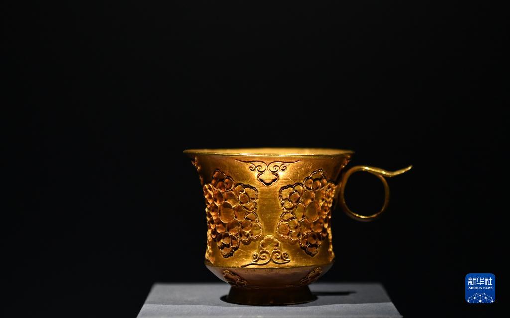 這是在陜西歷史博物館拍攝的掐絲團花紋金杯(5月11日攝)。唐代帶把杯除部分器物直接來(lái)自中亞粟特,還有部分屬于唐人仿制粟特風(fēng)格的作品,這些物品都是東西方文明通過(guò)絲綢之路進(jìn)行交流互鑒的的珍貴物證。