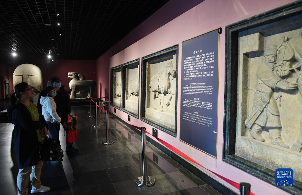 5月9日,游客在西安碑林博物館內參觀(guān)昭陵六駿石雕。唐昭陵六駿石刻是為紀念六匹隨唐太宗李世民征戰疆場(chǎng)的戰馬而刻制的,其中特勤驃等馬匹帶有明顯的西域良馬特征。