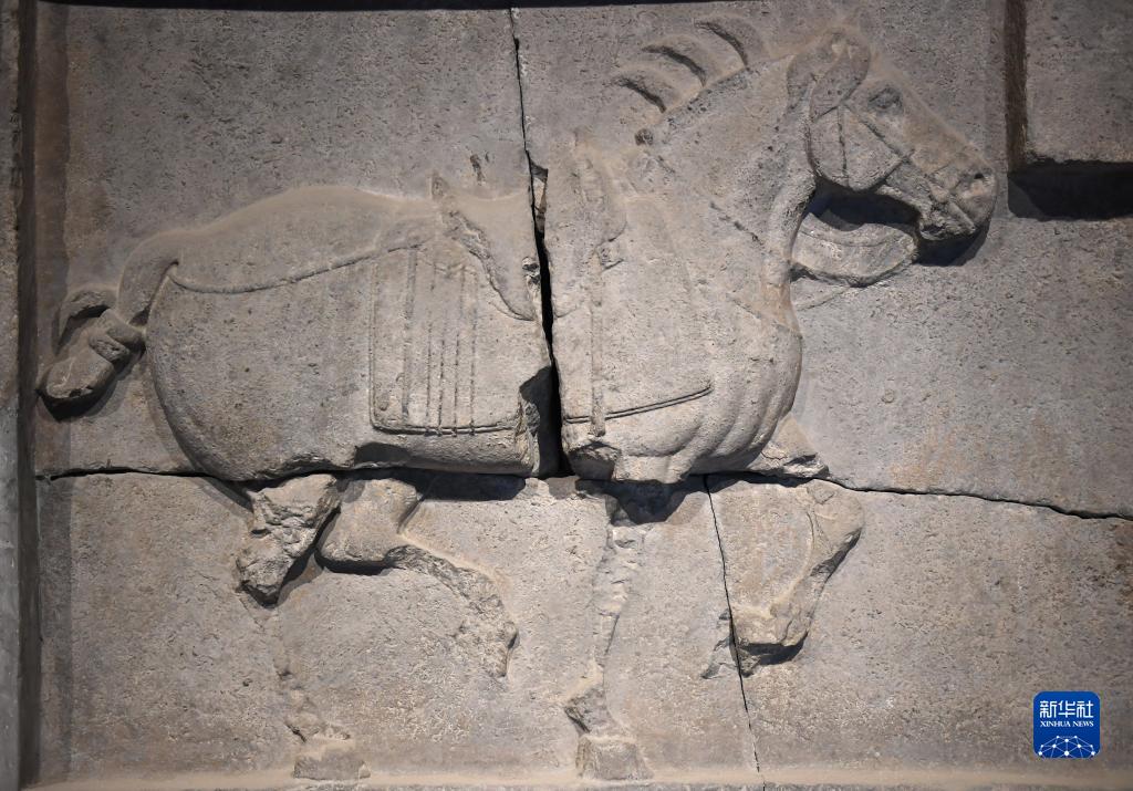 這是在西安碑林博物館內拍攝的昭陵六駿石雕特勤驃(5月9日攝)。唐昭陵六駿石刻是為紀念六匹隨唐太宗李世民征戰疆場(chǎng)的戰馬而刻制的,其中特勤驃等馬匹帶有明顯的西域良馬特征。