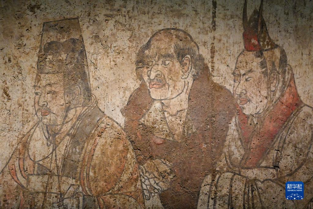 這是在陜西歷史博物館拍攝的唐章懷太子墓《客使圖》(局部)(5月11日攝)?!犊褪箞D》描繪的是唐代外交機構鴻臚寺官員接待外國使節的場(chǎng)景。