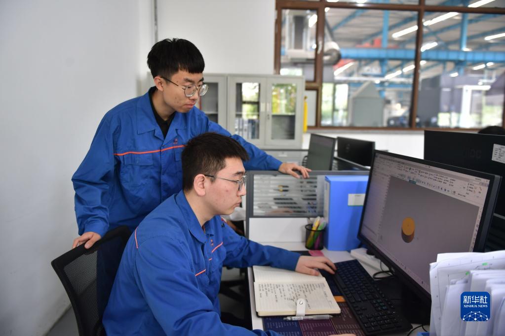 5月12日,在沈陽(yáng)睿昇精密制造有限公司,一名已和企業(yè)簽約的沈陽(yáng)工學(xué)院機械工程與自動(dòng)化學(xué)院畢業(yè)生(下)在企業(yè)車(chē)間辦公室設計零部件。