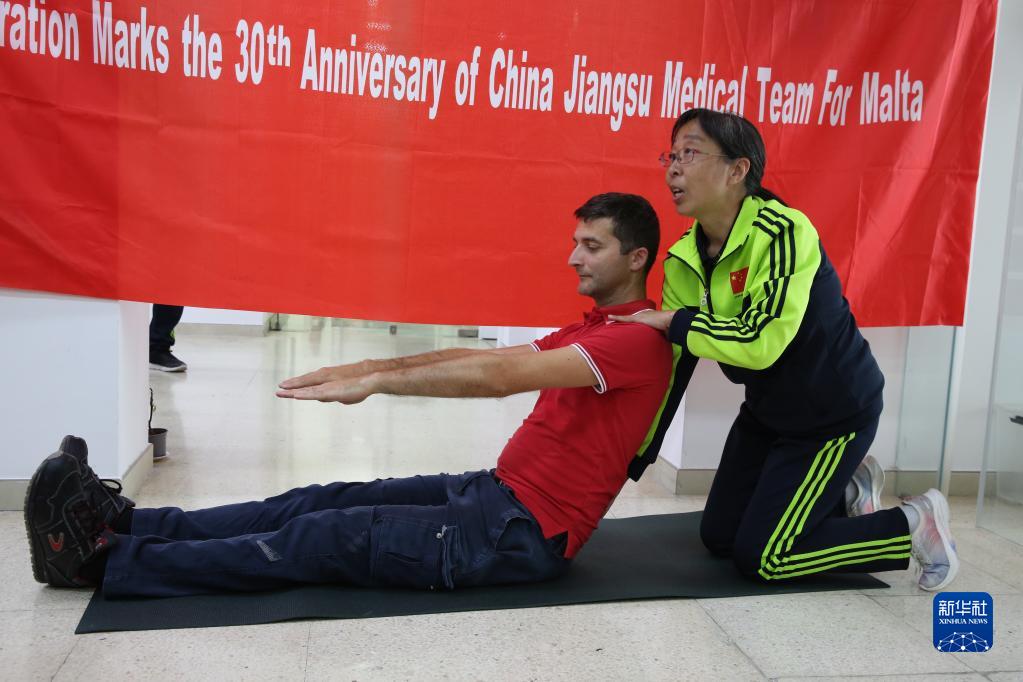 5月12日,在馬耳他馬爾薩什洛克,中國第18期援馬耳他醫療隊隊員邢雪梅在一名員工的幫助下演示頸腰痛康復治療的訓練動(dòng)作。