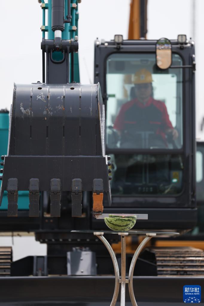 5月13日,在長(cháng)沙國際工程機械展覽會(huì )上,機手駕駛挖掘機切西瓜。