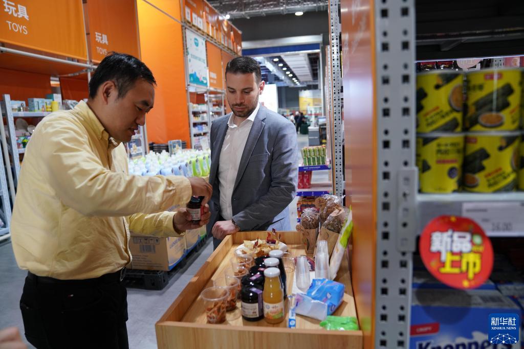 5月13日,在虹橋品匯進(jìn)博暢購集,工作人員向消費者展示商品。