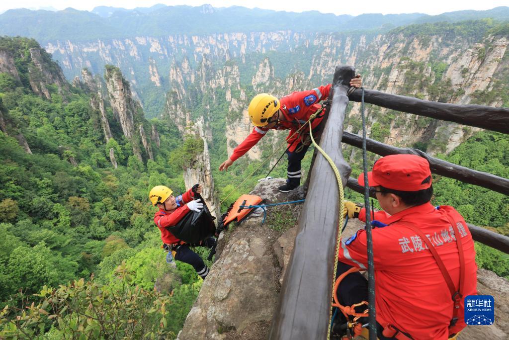 5月14日,張家界市武陵源區山地應急救援隊隊員在天子山的絕壁間索降。