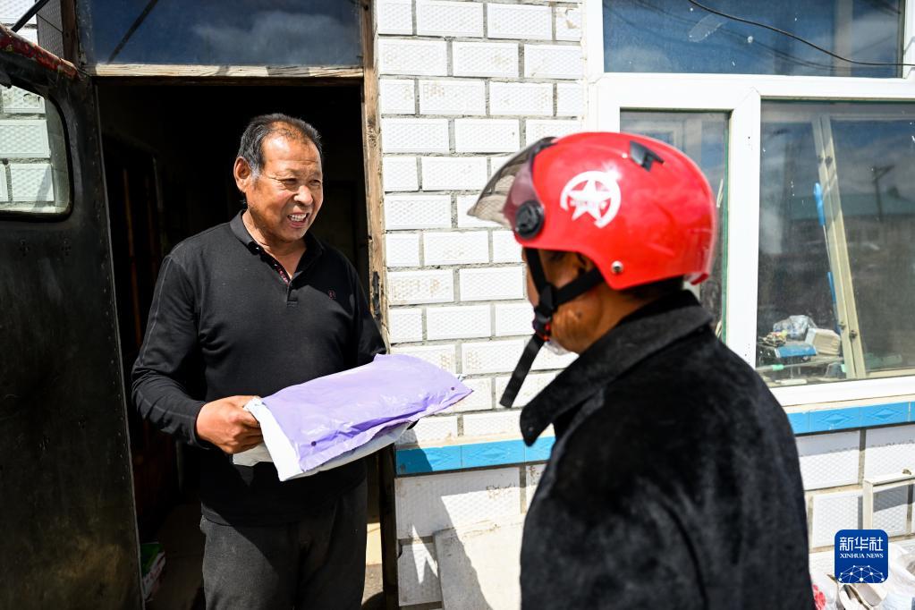 5月13日,在阿榮旗孤山屯村,于慶柱(右)將快遞送給行動(dòng)不便的村民。