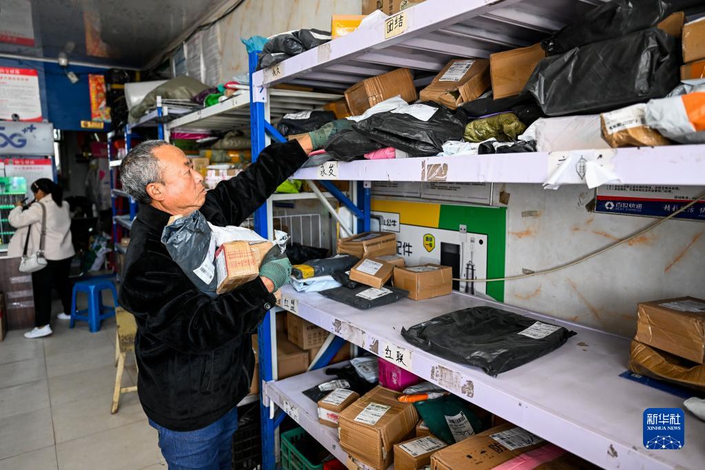 5月13日,在阿榮旗紅花梁子社區快遞驛站,于慶柱在分揀快遞。