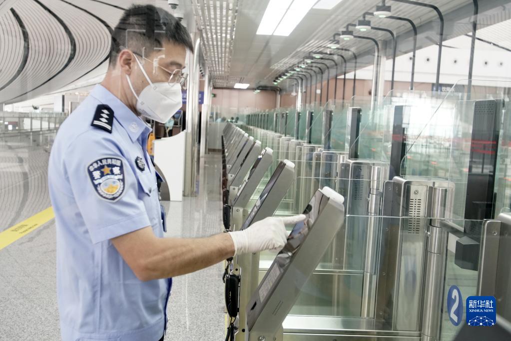 5月15日,北京大興機場(chǎng)邊檢站的民警在快捷通道查驗設備。