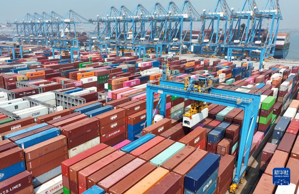 山東港口青島港全自動(dòng)化碼頭進(jìn)行裝卸作業(yè)(5月14日攝,無(wú)人機照片)。