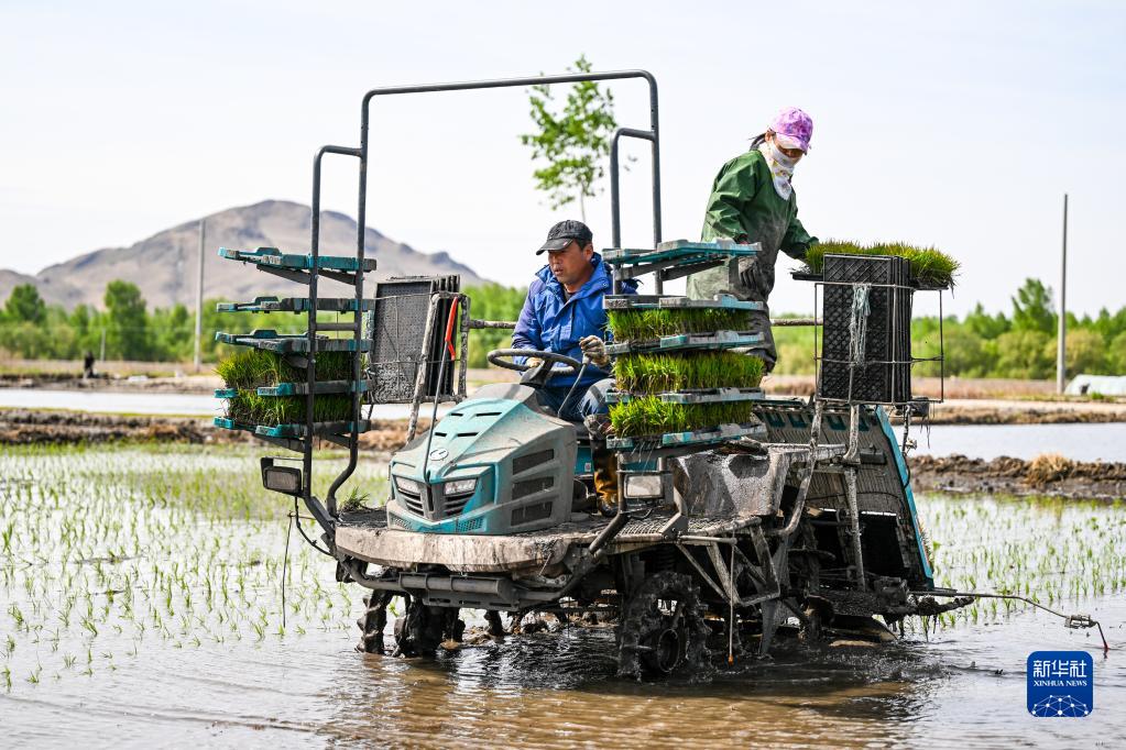 5月15日,農民駕駛插秧機在興安盟烏蘭浩特市的水稻田中插秧。
