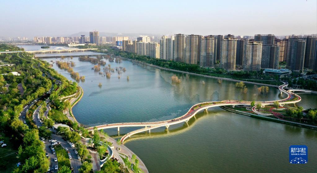 位于西安浐灞生態(tài)區的灞河兩岸景色(4月16日攝,無(wú)人機照片)。
