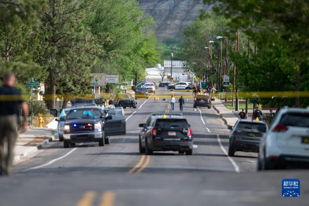 這是5月15日在美國新墨西哥州法明頓市拍攝的槍擊事件現場(chǎng)。