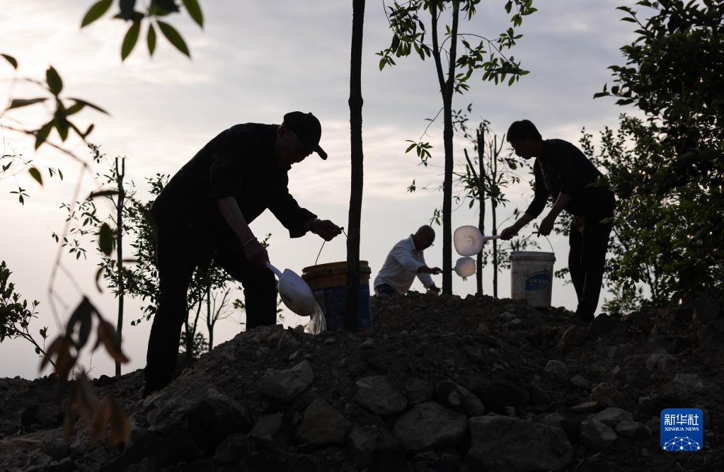 5月14日,李秀雄(左)在四川省榮縣東興鎮長(cháng)興林場(chǎng)一處山坡給桂花樹(shù)苗澆水。