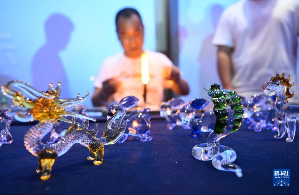 5月16日,民間藝人譚志國展示手工制作玻璃工藝品技藝。