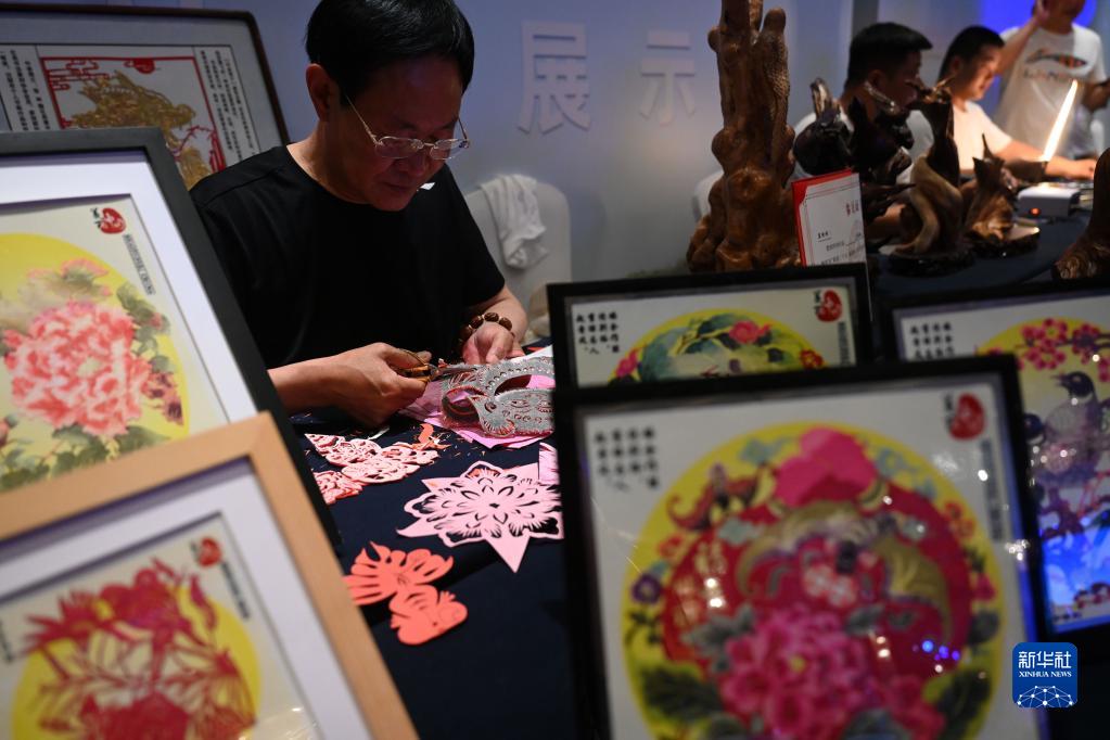 5月16日,民間藝人張林展示滿(mǎn)族手工剪紙技藝。
