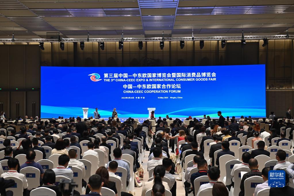 5月16日拍攝的在寧波國際會(huì )議中心舉行的第三屆中國—中東歐國家博覽會(huì )暨國際消費品博覽會(huì )開(kāi)幕式。
