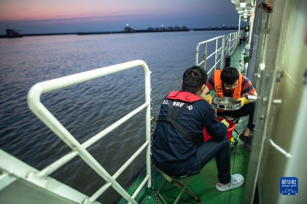 5月12日,監測人員熊少凱(后)、韓堂瑞在篩洗采集到的底棲動(dòng)物樣品。