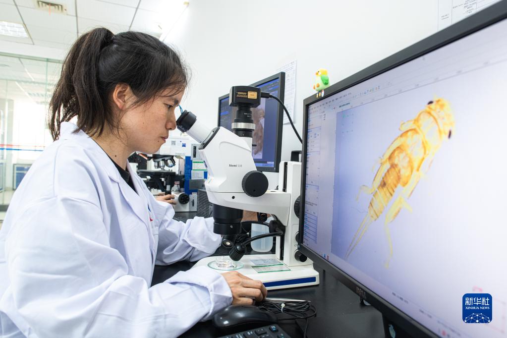 5月15日,在長(cháng)江流域生態(tài)環(huán)境監督管理局實(shí)驗室,監測人員周明春對采集到的底棲動(dòng)物樣品進(jìn)行鑒定。