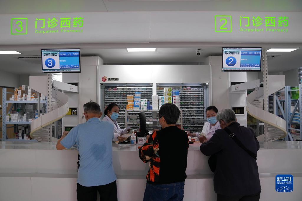 5月16日,人們在江蘇省鎮江市潤州區黎明社區衛生服務(wù)中心門(mén)診取藥。