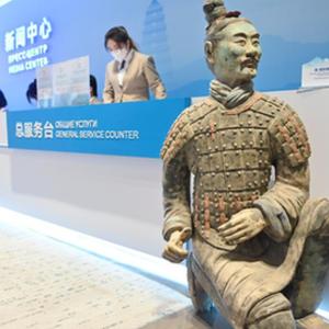 這是中國-中亞峰會(huì )新聞中心總服務(wù)臺旁的兵馬俑擺件(5月16日攝)。