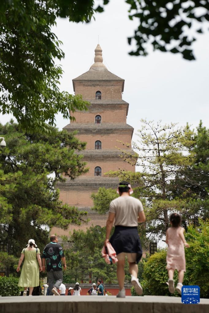 5月16日,游客在西安大雁塔景區游覽。