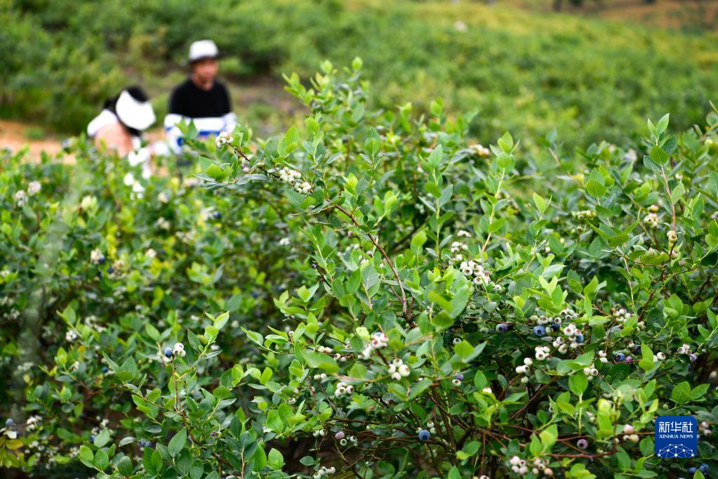 5月16日,人們在貴州省麻江縣宣威鎮翁保村藍莓園采摘藍莓。