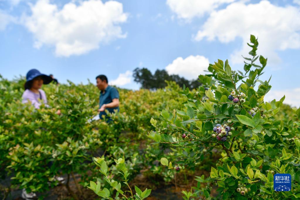 5月16日,人們在貴州省麻江縣宣威鎮翁保村藍莓園采摘藍莓。