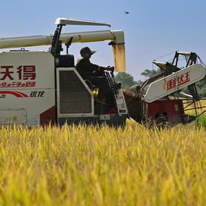 5月16日,收割機在稻田作業(yè)(無(wú)人機照片)。