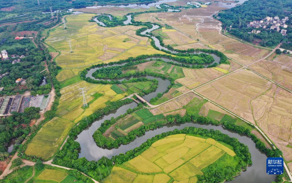 5月以來(lái),位于??谑腥獌砂兜乃具M(jìn)入夏收時(shí)節,一片片成熟的稻田與蜿蜒曲折的河道交織,勾勒出一幅美麗的畫(huà)卷。
