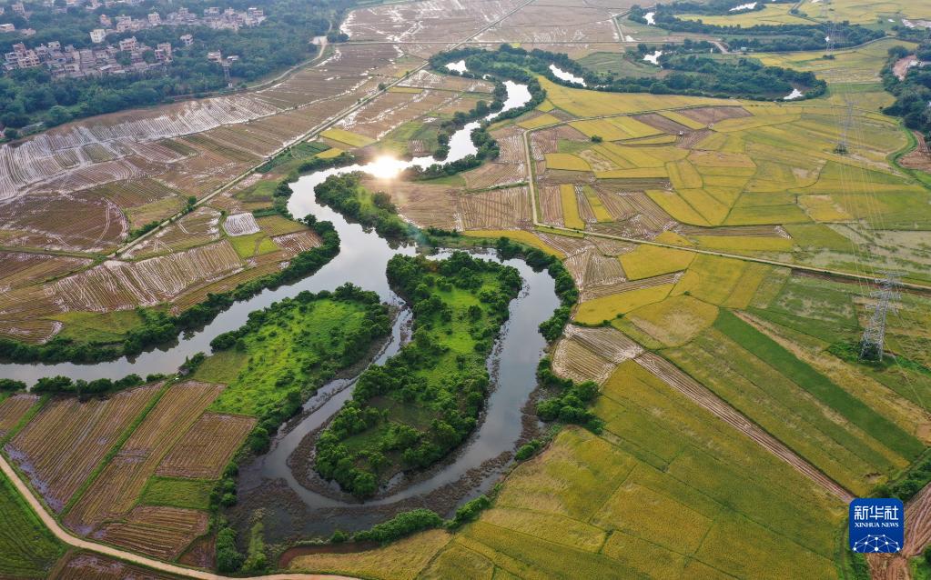 5月以來(lái),位于??谑腥獌砂兜乃具M(jìn)入夏收時(shí)節,一片片成熟的稻田與蜿蜒曲折的河道交織,勾勒出一幅美麗的畫(huà)卷。