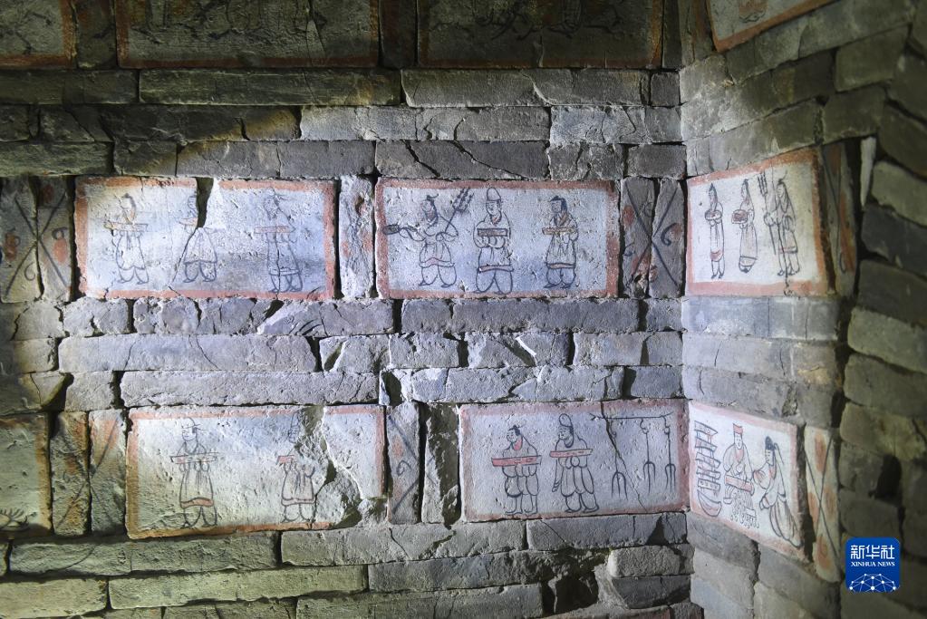 在嘉峪關(guān)魏晉墓六號墓的畫(huà)像磚上,繪有男主人宴請賓客的畫(huà)面,內容表現了仆人在加工烤肉、蒸食物、端著(zhù)托盤(pán)給主人用餐的場(chǎng)景(5月10日攝)。