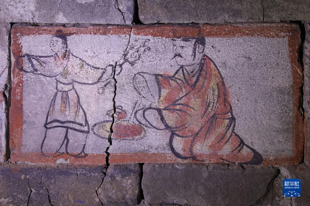 在嘉峪關(guān)魏晉墓六號墓的畫(huà)像磚上,仆人(左)拿著(zhù)烤肉遞給衣著(zhù)華麗的男主人享用(5月13日攝)。